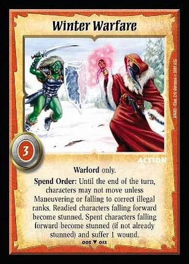 Rescue and Winter Warfare have both been added to the Restricted list. With the Kingswood rules revamp of July ‘23, targeting took on a whole new importance. While this has been good for a number of cards still on our watch list (Potion of Blurring, Fight Across the Rooftops), it helped no card like it did Rescue, a level 3 classless action, which could now cancel essentially anything your opponent tried to do to you that wasn’t a melee strike for the low cost of -5 skill. While there are cards that punish this skill loss, Rescue is actually pretty good against most of those as well. Over the year and a half these rules have been in place, we’ve seen Rescue go from an occasional include to a near obligatory 3-of in any deck that doesn’t rely on its Warlord’s skill. And so, like Toren Yscar of old, Rescue is getting limited to 1 per deck.