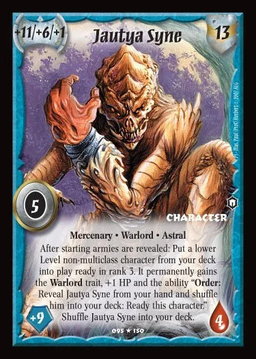 Jautya Syne is Unbanned. Jautya is the only Warlord that has ever been banned in Ancients and now he is free. No longer bound to the beloved Oops All Jautya! format, the shapeshifting Mercenary is ready to make a statement in Ancients. There had been concerns voiced over a “Jautya tool-box” deck, that started Fylgia against ranged strikers, Rr’gent against people trying to draw etc., etc. Well let’s see it! If you can build a deck that beats someone other than Rreg’jen while starting Rr’gent as your Warlord, maybe you deserve the win. And if 5E sees the release of Peyton Latham on steroids, we’ll cross that bridge when we come to it. Until then, everyone’s favorite Alien/Predator lovechild from the Plane of Secrets is fair game.