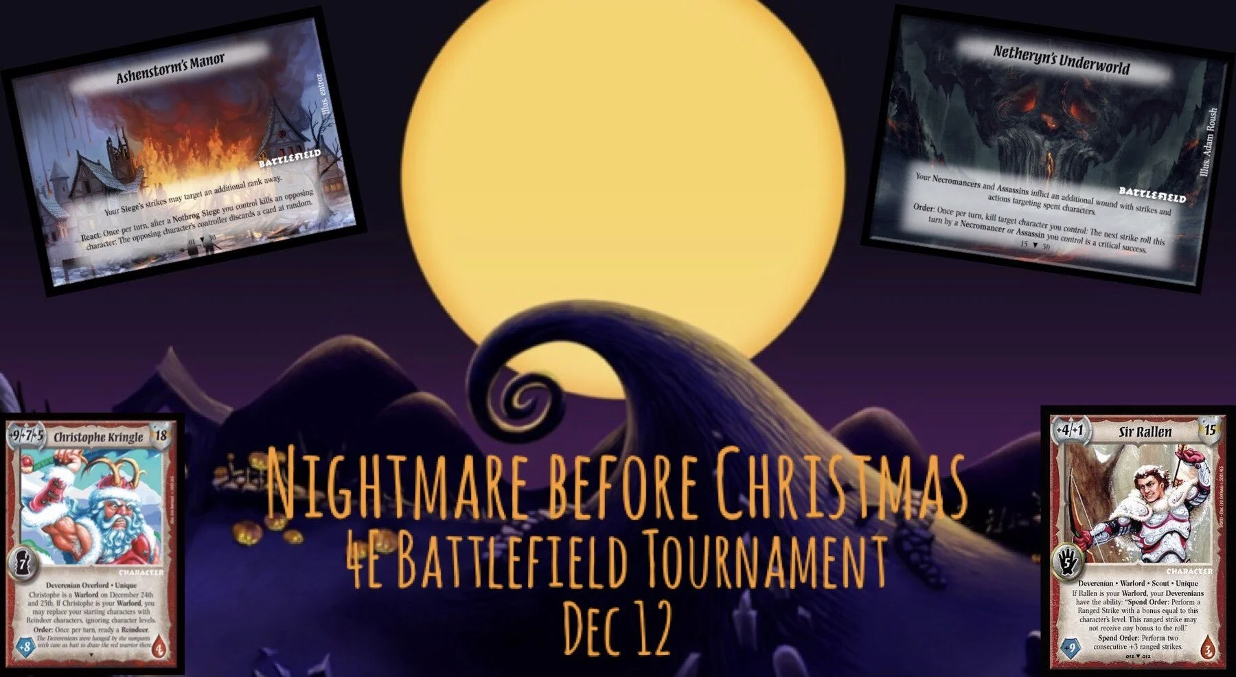 On Sunday, December 12 at 1pm, we will be hosting a 4E tournament at Table Top Tournaments in Crystal, Minnesota. Although we will be well into the Christmas season, we’ll also be revisiting the Spooky Battlefields currently featured in this month’s online tournament. In a Christmas x Halloween mashup Tim Burton himself would be proud of, Christophe Kringle will be available for challenges after the tournament.